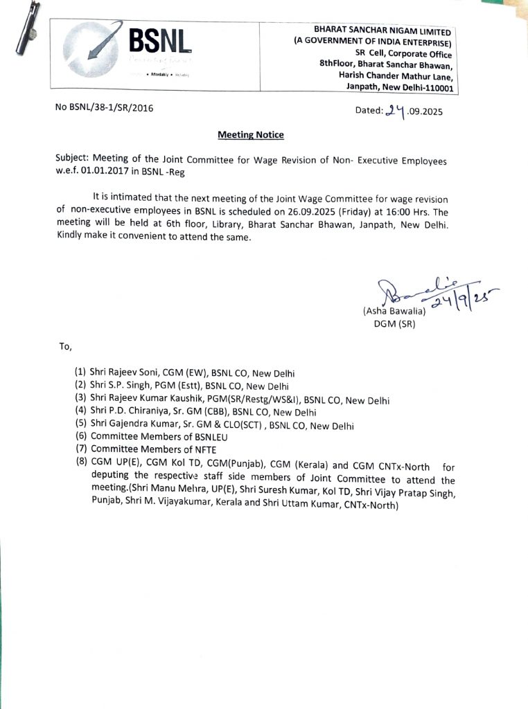 ശമ്പള പരിഷ്കരണ സമിതിയുടെ അടുത്ത യോഗം 26.09.2025 ന് നടക്കും. ബിഎസ്എൻഎൽ മാനേജ്മെന്റ് വിജ്ഞാപനം പുറപ്പെടുവിച്ചു.